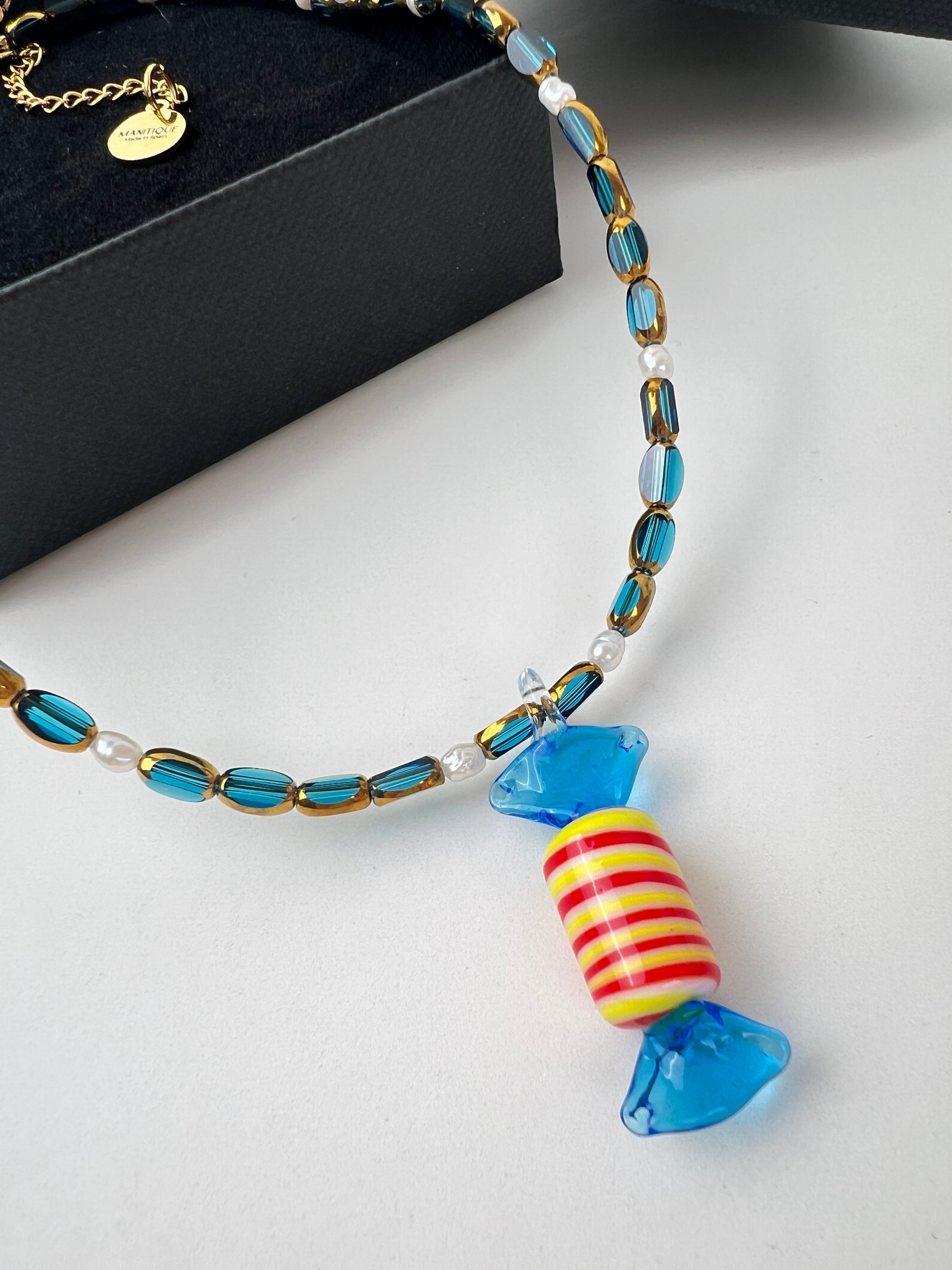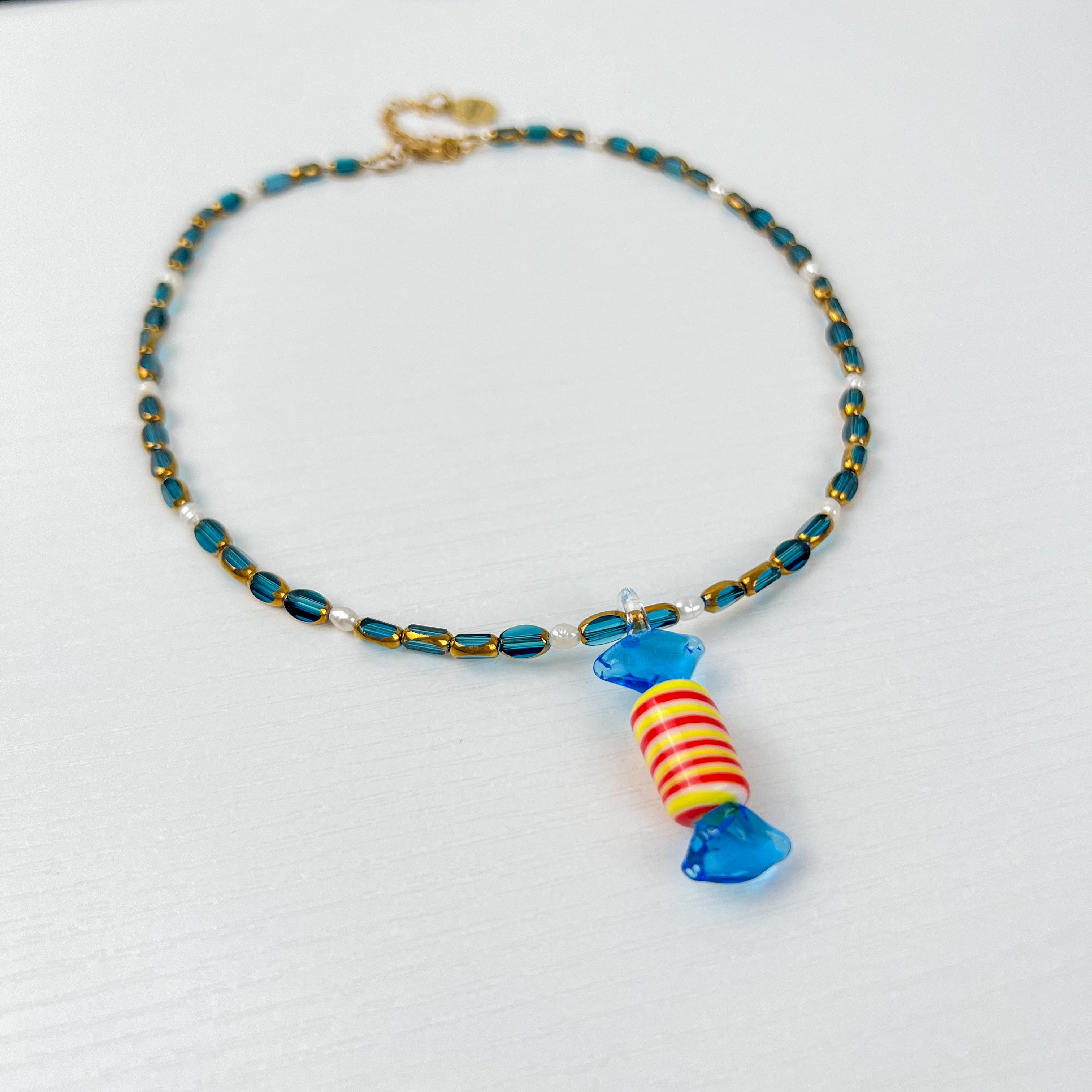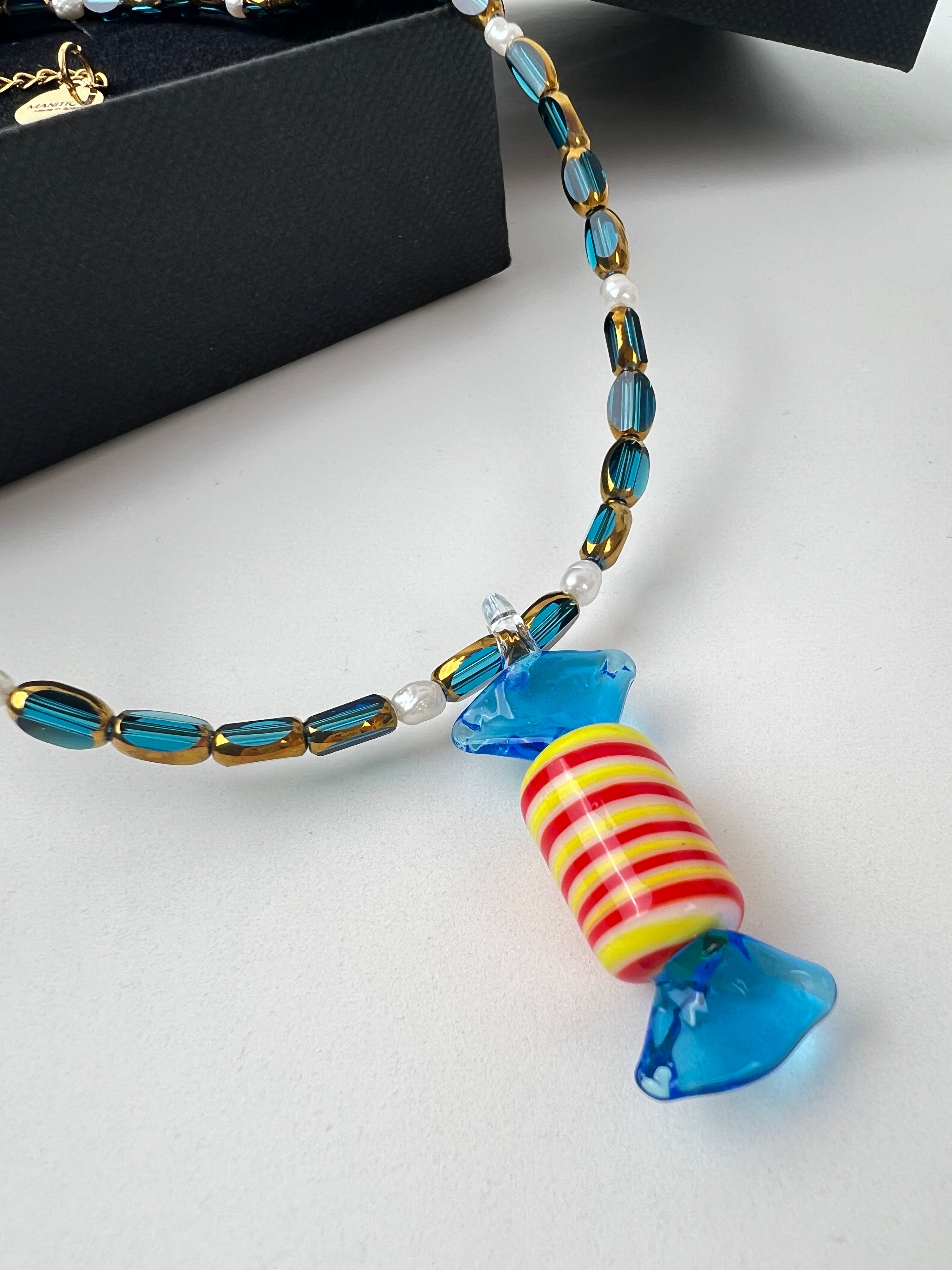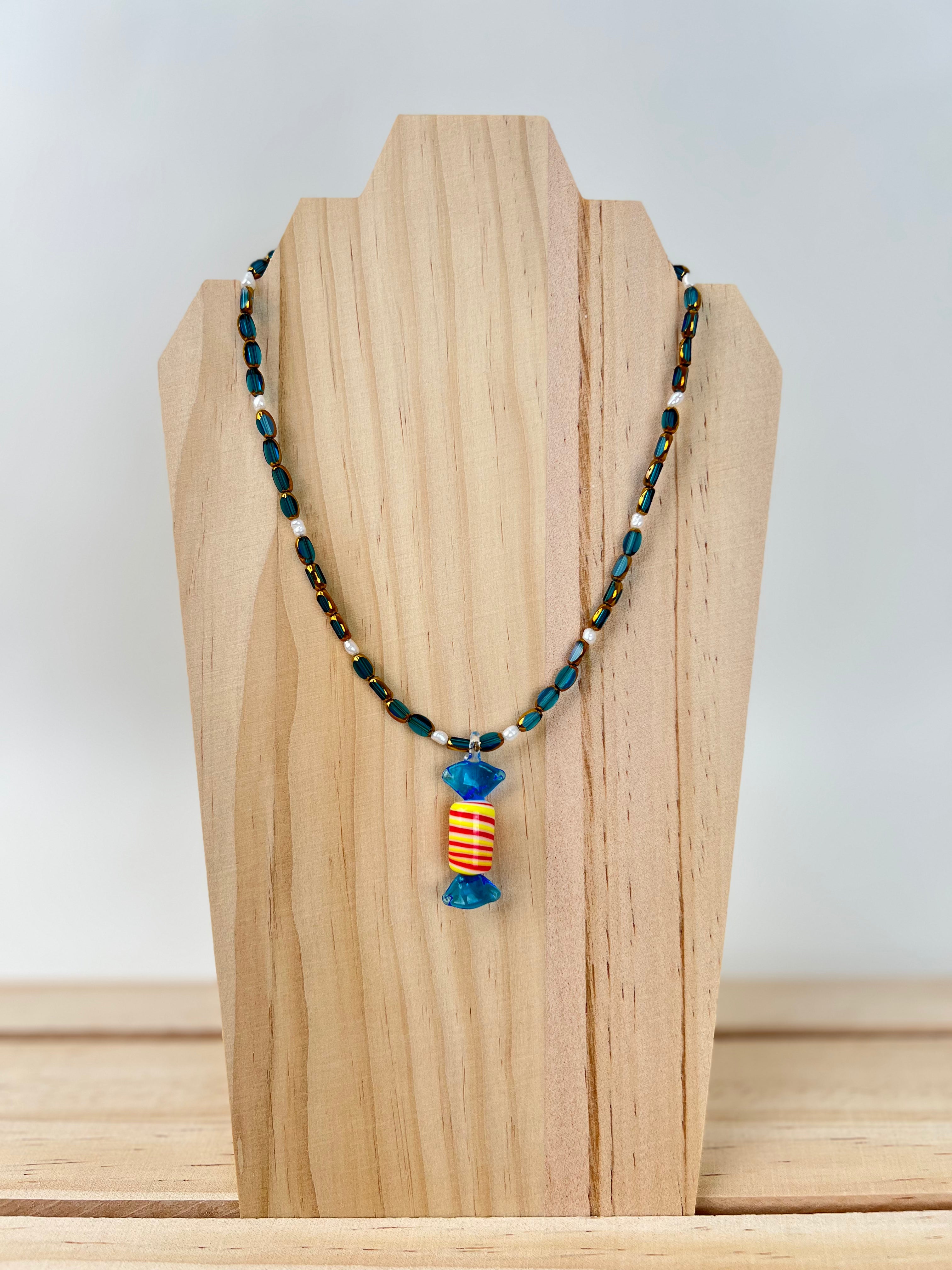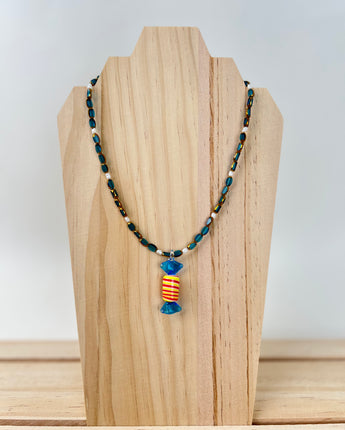 The necklace is made of glass beads, natural freshwater pearls and a lampwork glass pendant.